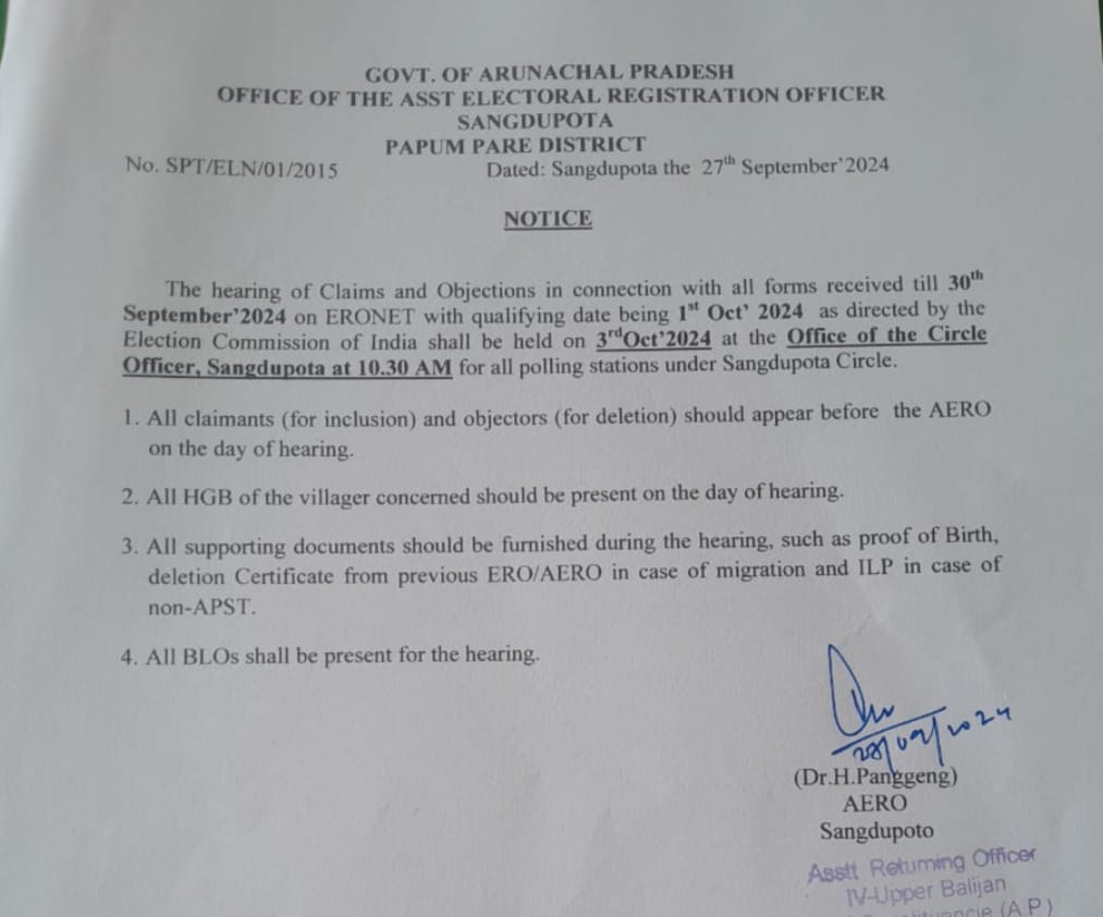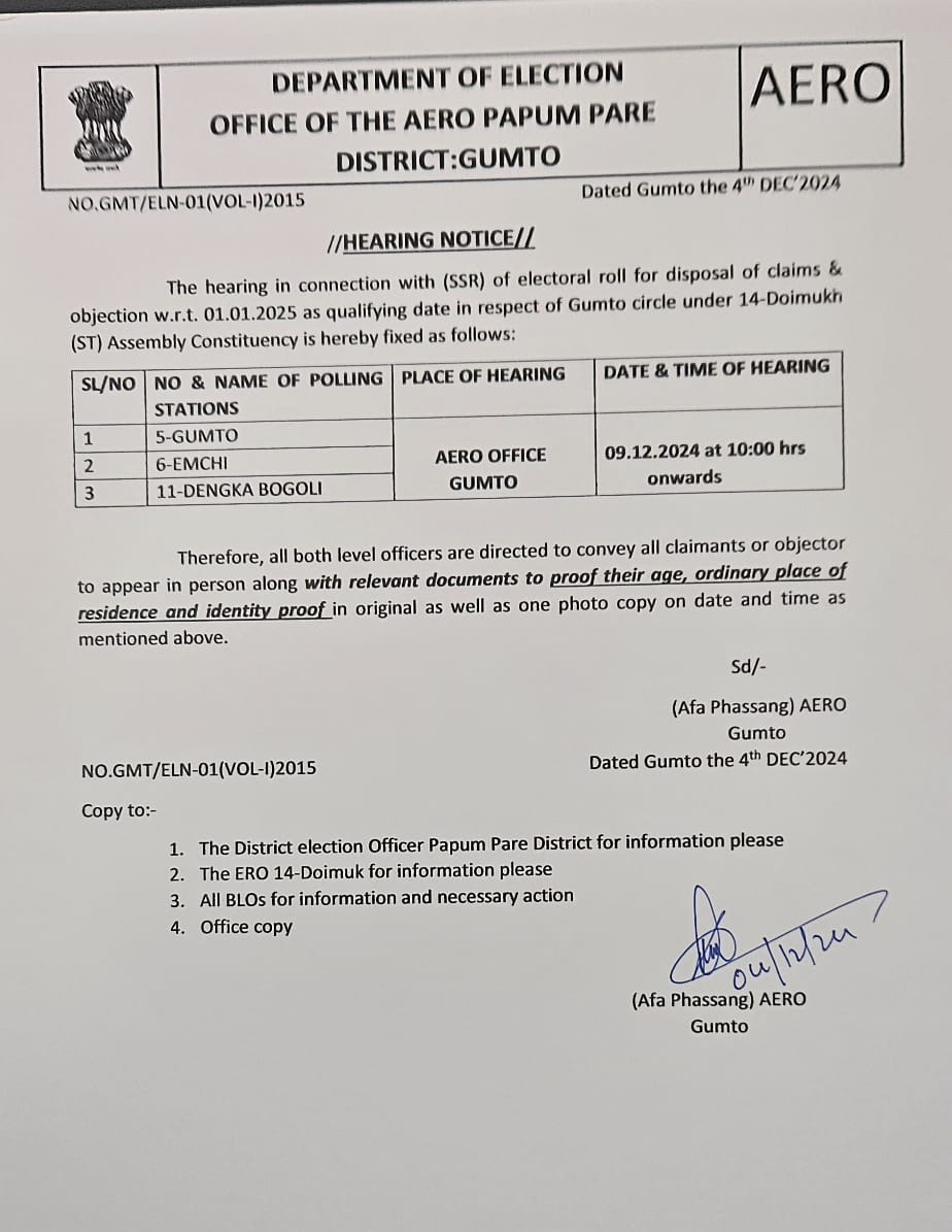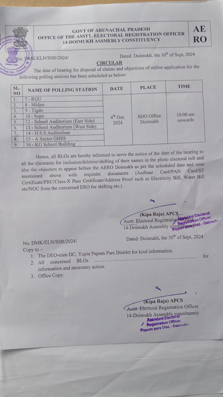 4. Hearing of claim & objection in respect of 14-Doimukh (ST) Assembly Constituency of Banderdewa circle.