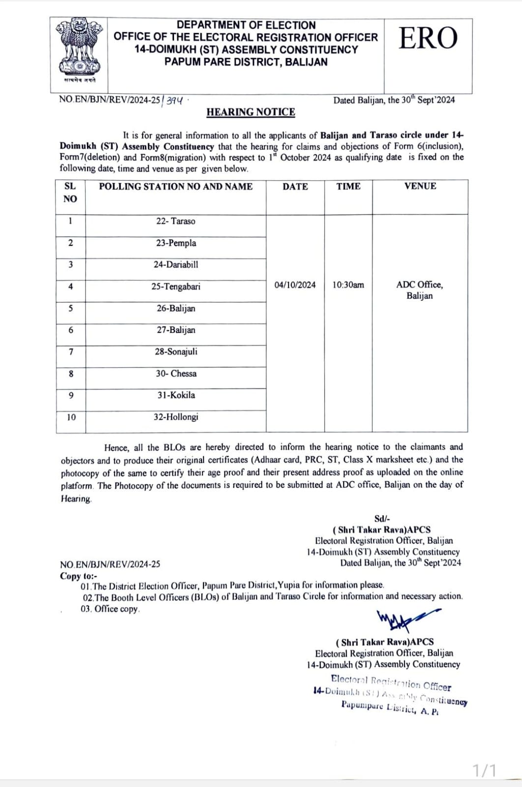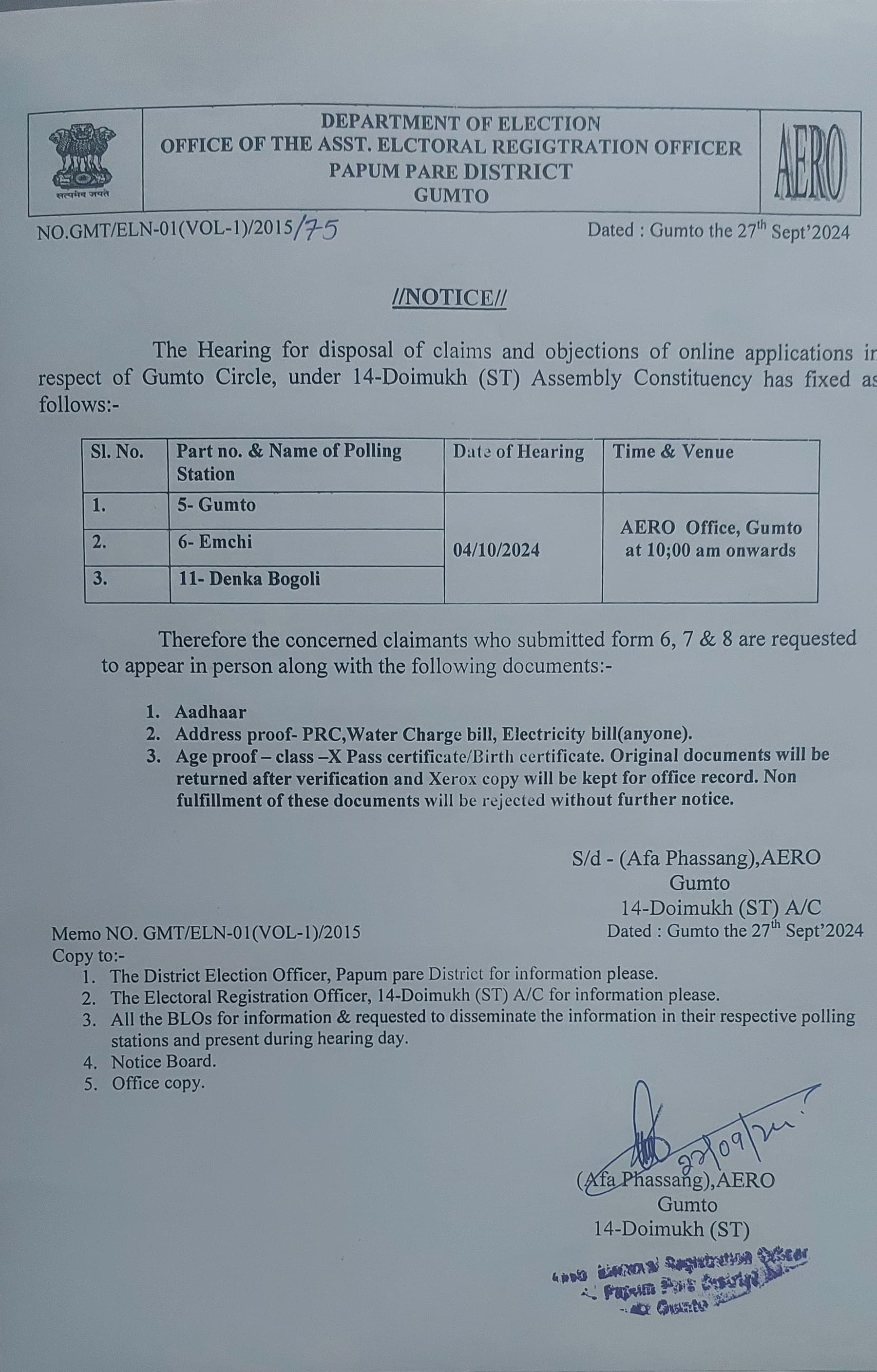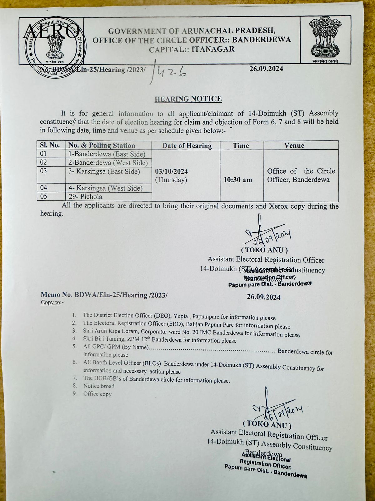 4. Hearing of claim & objection in respect of 14-Doimukh (ST) Assembly Constituency of Banderdewa circle.