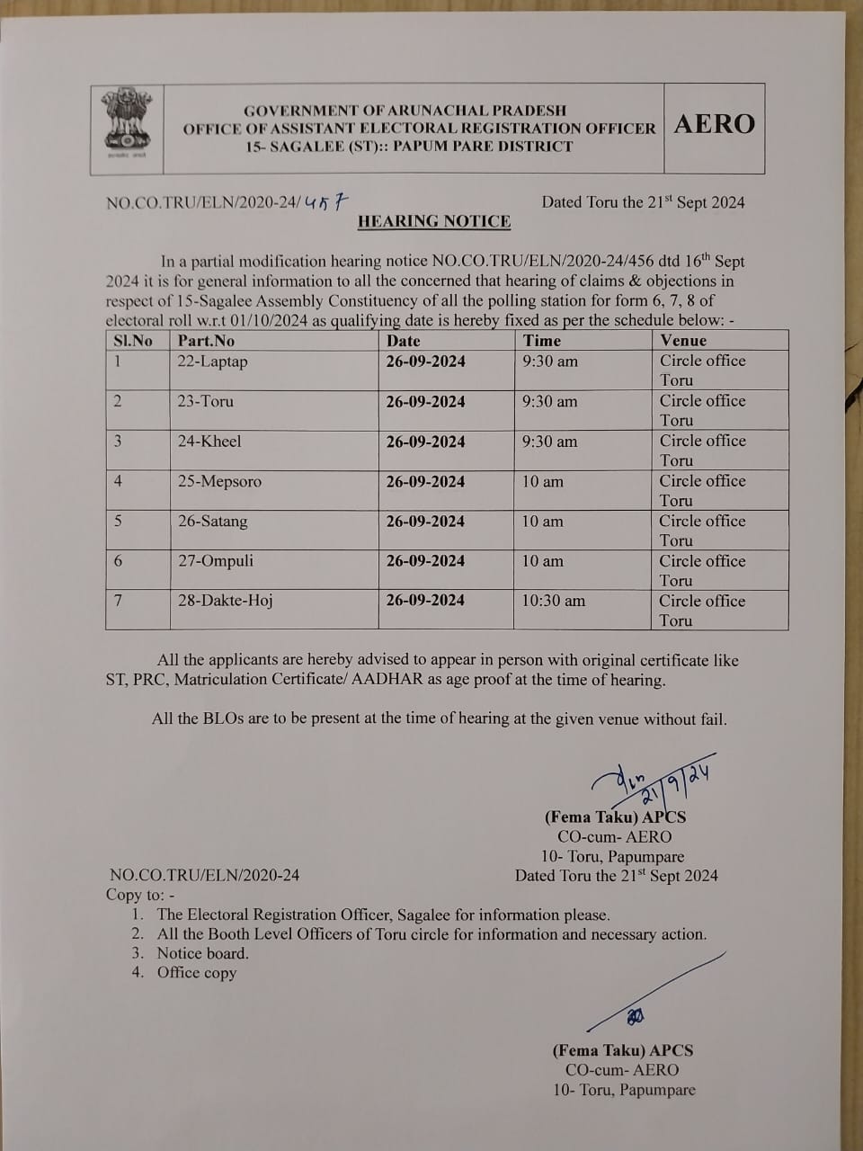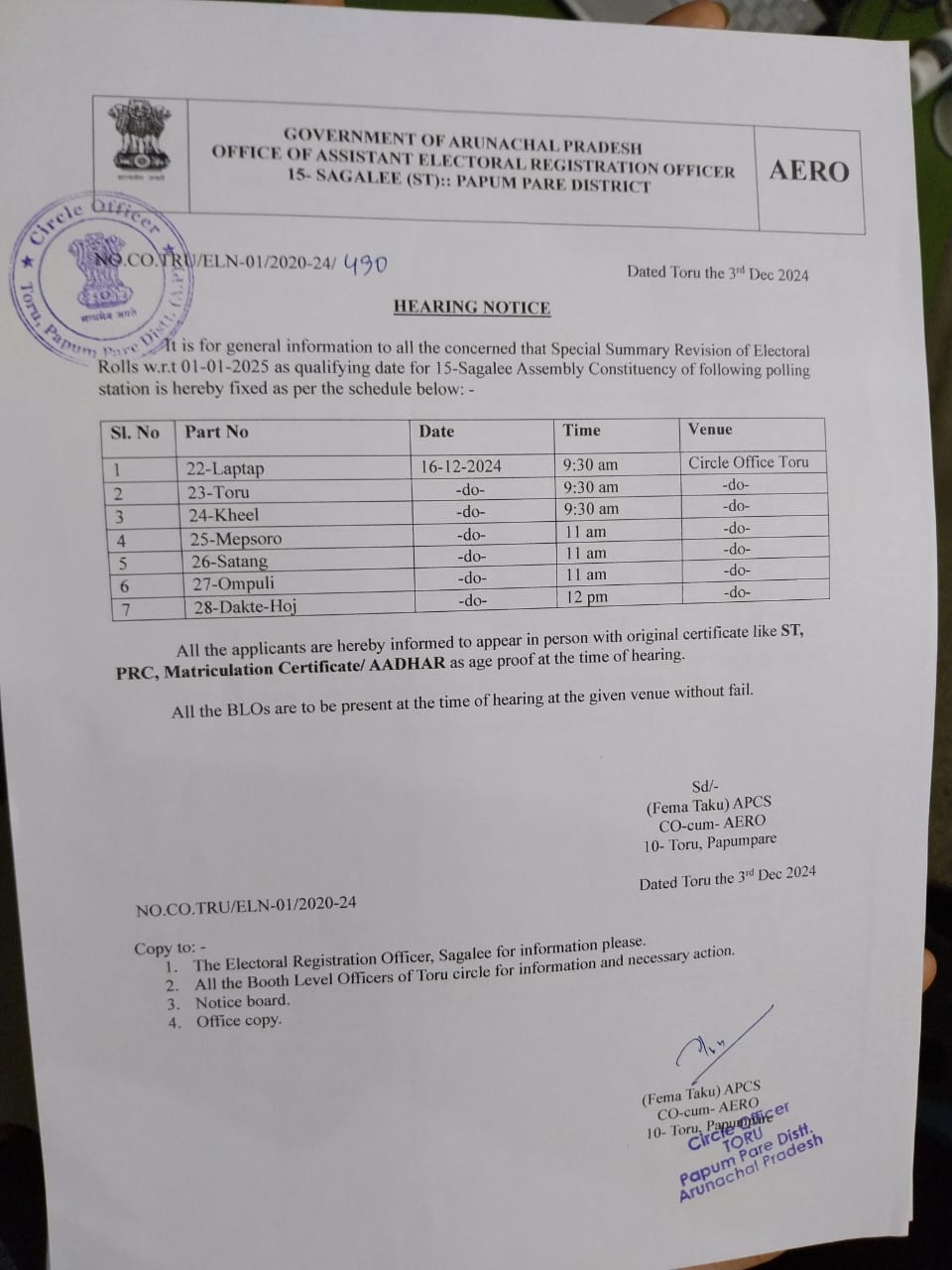 19. Special Summary Revision 2024-2025 of Elector Rolls w.r.t 01.01.2025 as qualifying date by AERO Naharlagun.